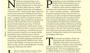 Przyglądając się pracownikom wrocławskiego studia, zastanawiałem się, co się stało z tymi wszystkimi ludźmi z Łąkowej. Jakie zawody, umiejętności i kompetencje bezpowrotnie przepadły, a jakie – mimo rewolucji cyfrowej – nadal byłyby przydatne polskiemu kinu? Dziś już nikt nie zaprzecza, że jedną z bolączek kinematografii jest brak hal zdjęciowych i specjalistycznych kadr. Artystów edukujemy z powodzeniem, z rzemieślnikami kształconymi czeladniczymi metodami mamy problem. Niektórzy nawołują do założenia technikum kinematograficznego (jak to było w Peerelu) lub stworzenia programów filmowych przy już istniejących. To słaby pomysł. Umiejętności nabywa się z obserwacji i pomagania mistrzom. [...]