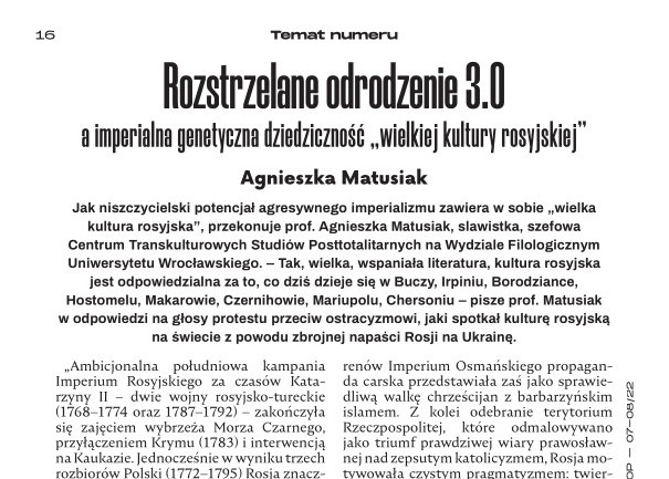 Po publikacji tekstu prof. Agnieszki Matusiak „Rozstrzelane odrodzenie 3.0” napisał do nas przywoływany przez autorkę prof. Tadeusz Klimowicz, który nie zgadza się z interpretacją jego poglądów na temat rosyjskiego imperializmu i przyczyn agresji na Ukrainę przedstawioną przez prof. Matusiak. Oto jego polemika.