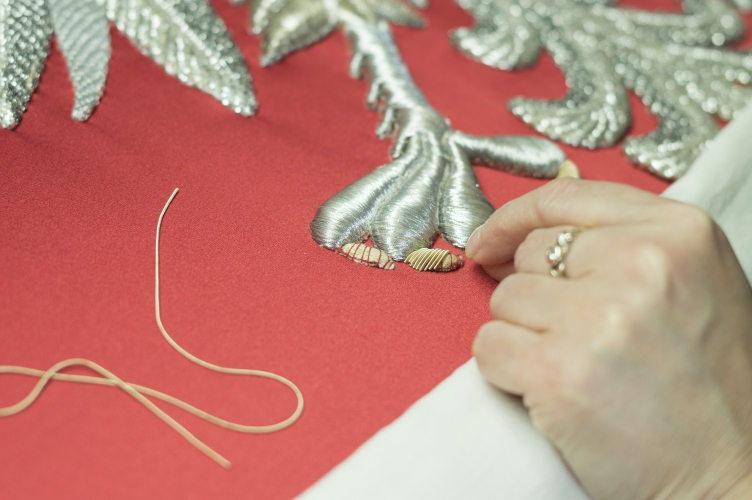 Bardzo dużym wyzwaniem było naprawienie haftu w kształcie orła – ze względu na to, że sztandar był przez lata zwijany i rozwijany, uszkodzeniu uległ bajorek (rodzaj srebrnej, metalowej nici w formie sprężynki, którą przyszywa się nitką przewlekaną przez jej środek). Wyjątkowo zniszczone elementy znajdowały się na najbardziej wypukłych detalach, takich jak gwiazdy w centralnych częściach skrzydeł. Po oczyszczeniu uszkodzonych elementów, rozpoczęło się żmudne pokrywanie bawełnianych podkładów tworzących wypukłości wzoru za pomocą kolejnych warstw metalowych nici. Ostatnim etapem prac nad haftem było układanie nowego bajorka – jest on bardzo delikatny, w związku z czym wymagał największej staranności podczas nawlekania na nici mocujące.