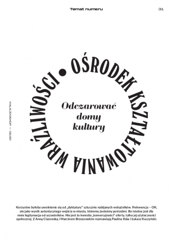 Gdyby zatrzymać się tylko na tym, po odsianiu urzędniczej nowomowy, obok Programu i tak trudno przejść obojętnie. Osoby, które go pisały, zatwierdzały i te, które będą odpowiadać za jego realizację, wzięły na siebie kolosalną odpowiedzialność. Co więcej, Program cechuje komplementarność – myślenie kategoriami zarówno miasta, jak i województwa, uczestników, jak i twórców, odbiorców i organizatorów, od strony zaplecza edukacyjnego i finansowego, od sfery tworzenia narzędzi do diagnozowania kultury po ocenę ewaluacji działań w ramach Programu. Do tego stawianie na lokalny wymiar kultury i lokalne kadry, podmiotowość uczestników i ich twórczy wkład w realizację Programu, oddanie pola nie tylko (jak dotąd) dzieciom i seniorom, ale też dostrzeżenie młodzieży i dorosłych jako równoprawnych odbiorców. W przypadku tego ostatniego założenia ze schematycznie budowanych ofert miejskich instytucji wypisywało się bodaj tylko Narodowe Centrum Kultury Filmowej – programem „Alfabetyzm filmowy” i projektem „Historie przyszłości. Reinterpretacje polskiego kina”.