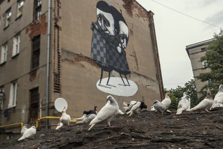 Redman prowadzi nas na ul. Więckowskiego 8, gdzie w podwórku zrealizowano „współczesny fresk” na podstawie obrazu Wojciecha Siudmaka „Narodziny dnia”. Wykonano go unikalną technologią (z wykorzystaniem płyt gresowych). Jest to trzecie artystyczne podwórko, po Pasażu Róży Joanny Rajkowskiej (przy ul. Piotrkowskiej 3) i „Sąsiadach” Isaaka Cordala (Traugutta 10). – Największe wrażenie, ze względu na formę artystyczną i sposób wykonania ozdób wywołuje Pasaż Róży. Wszystkie ściany widoczne na podwórku pokryte zostały mozaiką ze szkła lustrzanego, które mieni się w słońcu – mówi Redman. – Najmniej znana jest instalacja artystyczna „Sąsiedzi”, nawiązująca do relacji dobrosąsiedzkich, podtrzymywanych niegdyś podczas rozmów na balkonach. Obecnie zwyczaj ten odchodzi w zapomnienie – ubolewa. Zwiedzając podwórko przy Traugutta 10 warto uważnie się rozejrzeć, bo na pierwszy rzut oka często dostrzegamy instalację tylko na jednej ścianie, a jest zamontowana na dwóch.